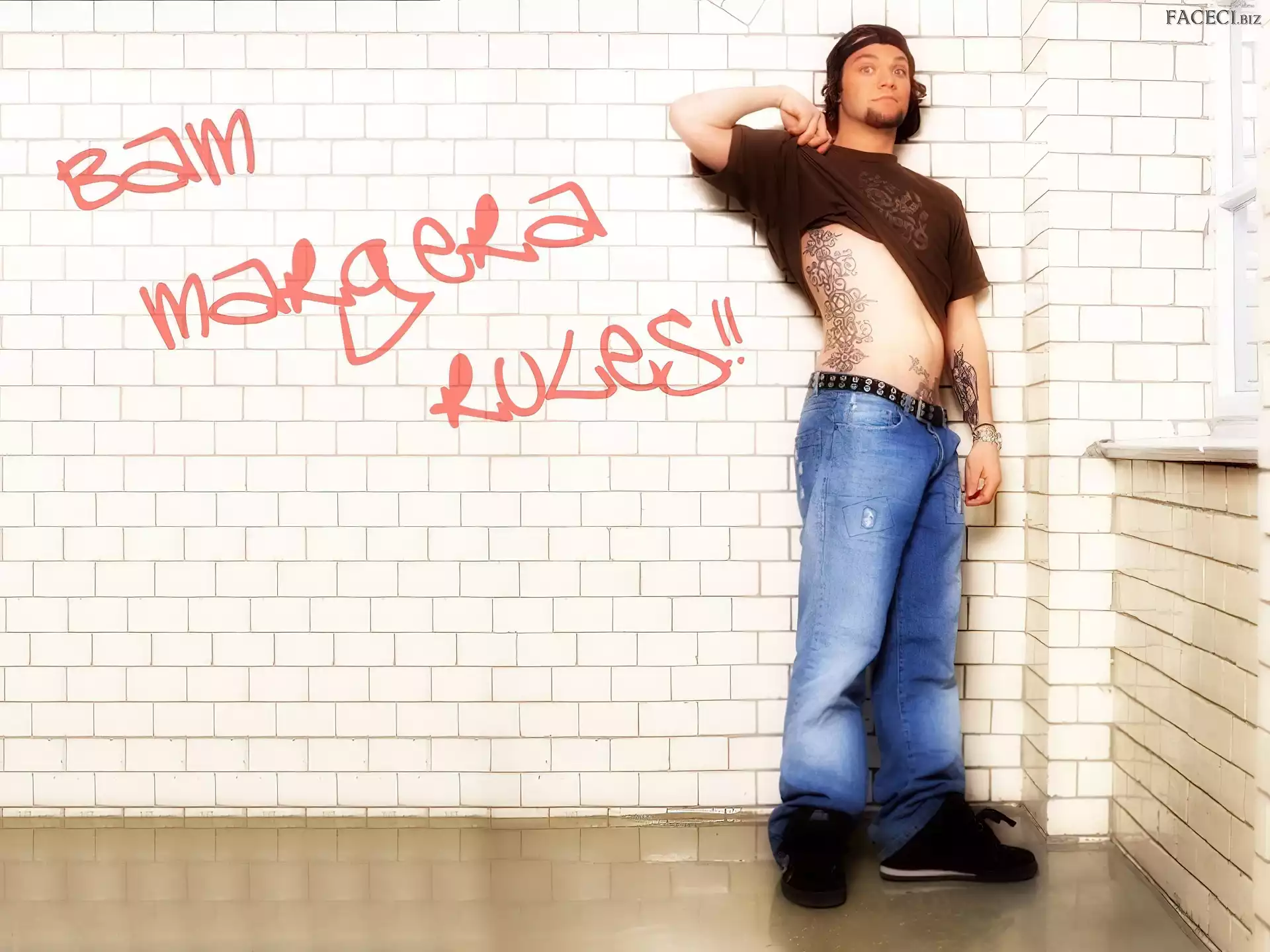t-shirt, Bam Margera, brązowy kurtka, Bam Margera, rozpięta okulary, Bam Margera, twarze zegarek, Bam Margera, deskorolka włosy, Bam Margera, ciemne okulary, Bam Margera, butelka